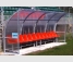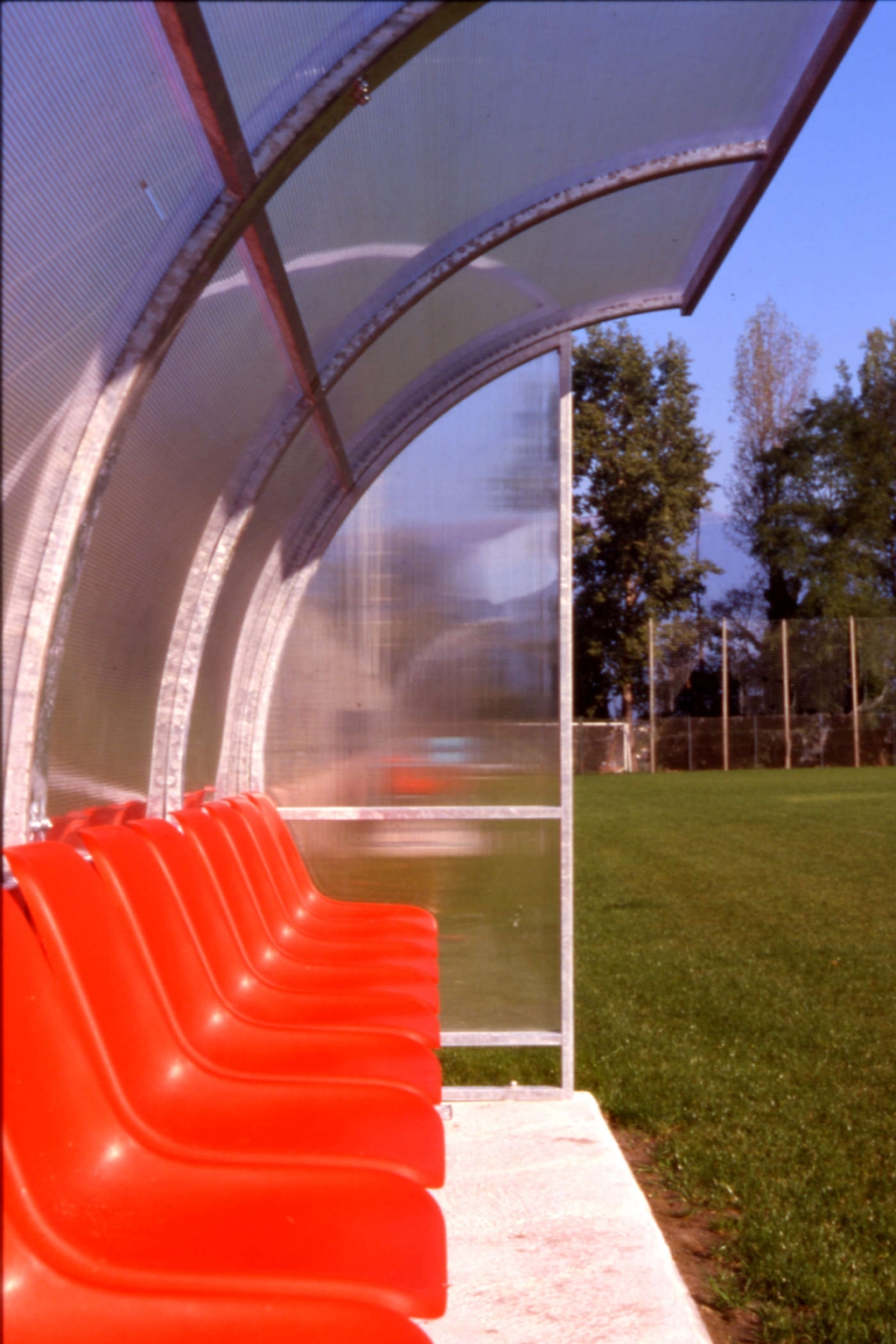 Charakteristika: Futbalová tímová striedačka s galvanizovanou oceľovou konštrukciou, konštrukcie s prierezom 50x30mm. Má nepriehľadné polykarbonátové panely s hrúbkou 4mm a polypropylénové oblé sedadlá. Šírka modulu 1m, 2 sedadlá.