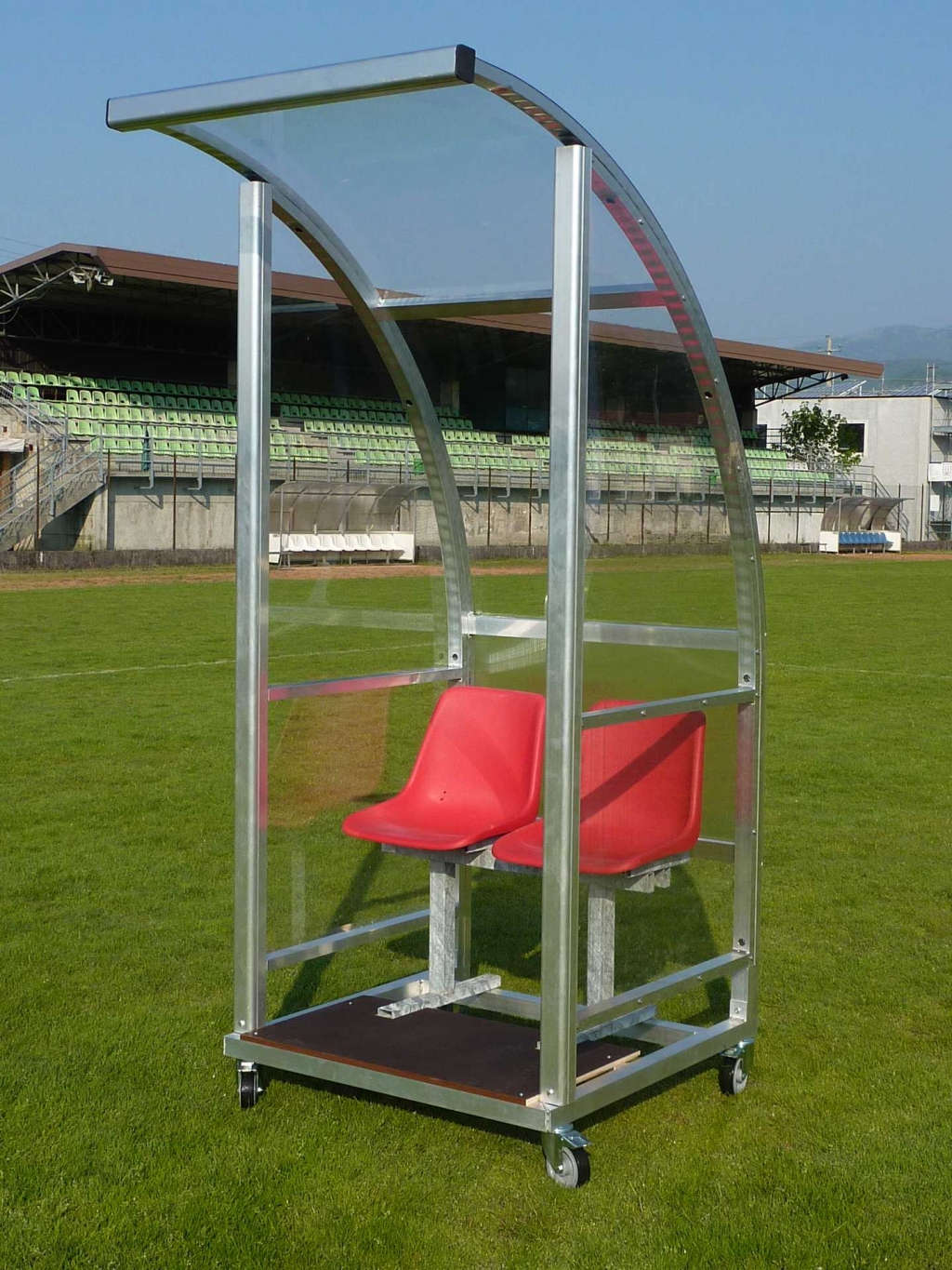 Charakteristika: Futbalová tímová striedačka je pevne fixovaný model so zliatinovou hliníkovou konštrukciou, predná časť konštrukcie je s prierezom 60x70mm. Má priehľadné polykarbonátové panely s hrúbkou 3mm a polypropylénové sedadlá. Šírka modulu 5m, 10 sedadiel. Rozmery: výška 225cm, hĺbka na zemi 96cm, celková hĺbka 138cm