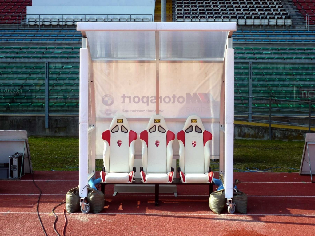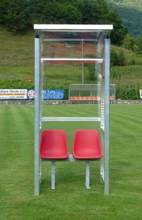 Charakteristika: Futbalová tímová striedačka je pevne fixovaný model so zliatinovou hliníkovou konštrukciou, predná časť konštrukcie je s prierezom 60x70mm. Má nepriehľadné polykarbonátové panely s hrúbkou 4mm a polypropylénové sedadlá. Šírka modulu 5m, 10 sedadiel. Rozmery: výška 225cm, hĺbka na zemi 96cm, celková hĺbka 138cm