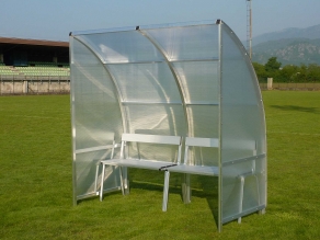 Futbalové tímové striedačky, model LIGHT - dvojsedadlo, zložené z hliníkových profilov, prierez 40x20mm, polykarnonátové panely o hrúbke 4,0mm, sedadlá sú sklápateľné vyrobené z galvanizovanej ocele. Modul je 1,0m široký.